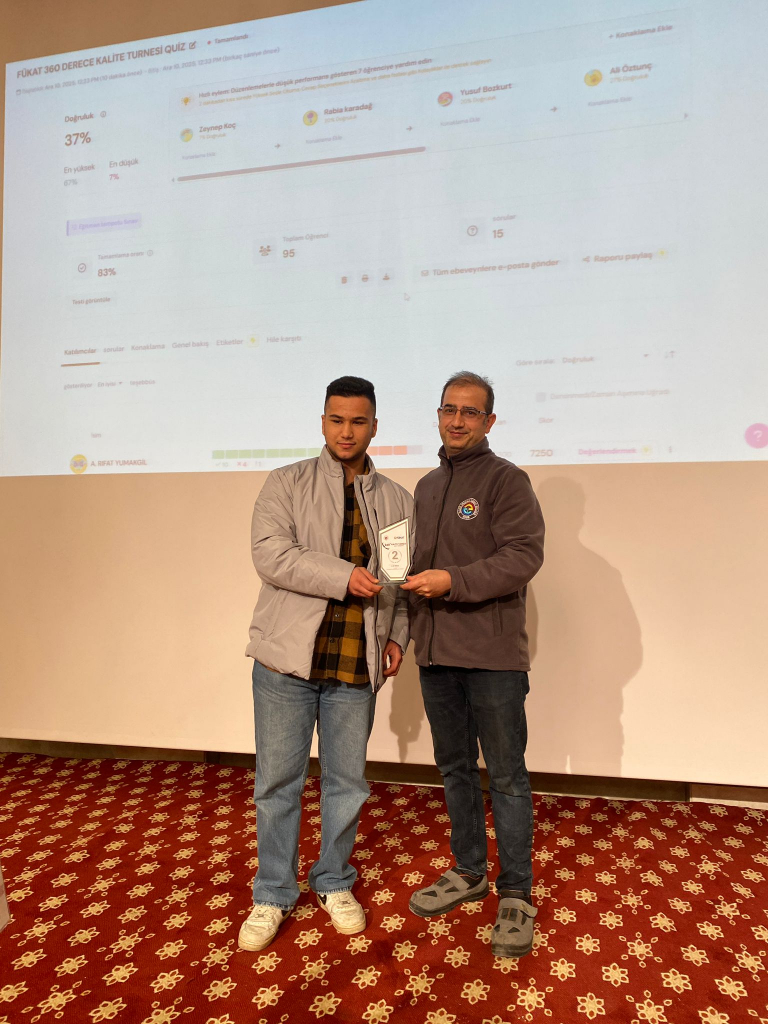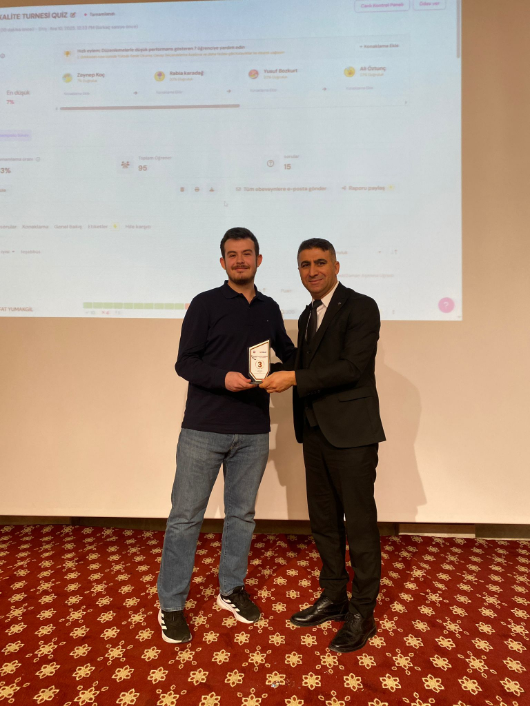 Etkinlik sonunda gerçekleştirilen quiz uygulaması ile öğrencilerin kazanımları ölçülmüş, yarışma sonucunda dereceye giren ilk üç öğrenciye ödülleri takdim edilmiştir. Etkileşimli yapısıyla dikkat çeken etkinlik, öğrencilerin kalite süreçlerine yönelik farkındalıklarının artmasına katkı sağlamıştır.